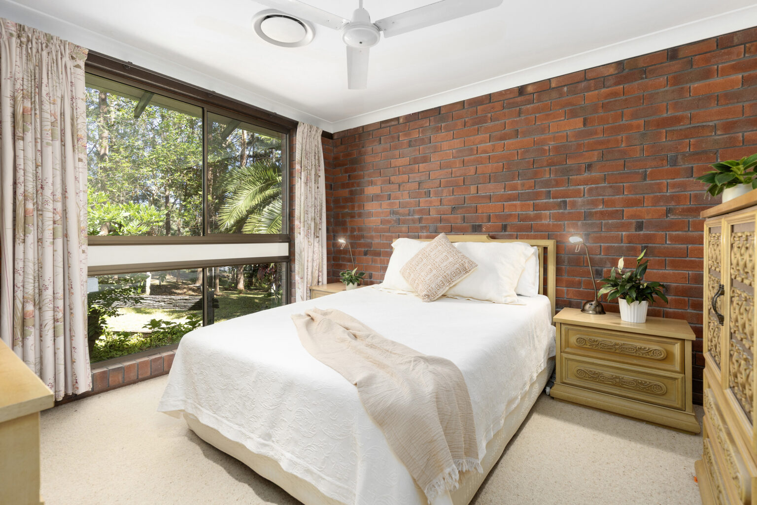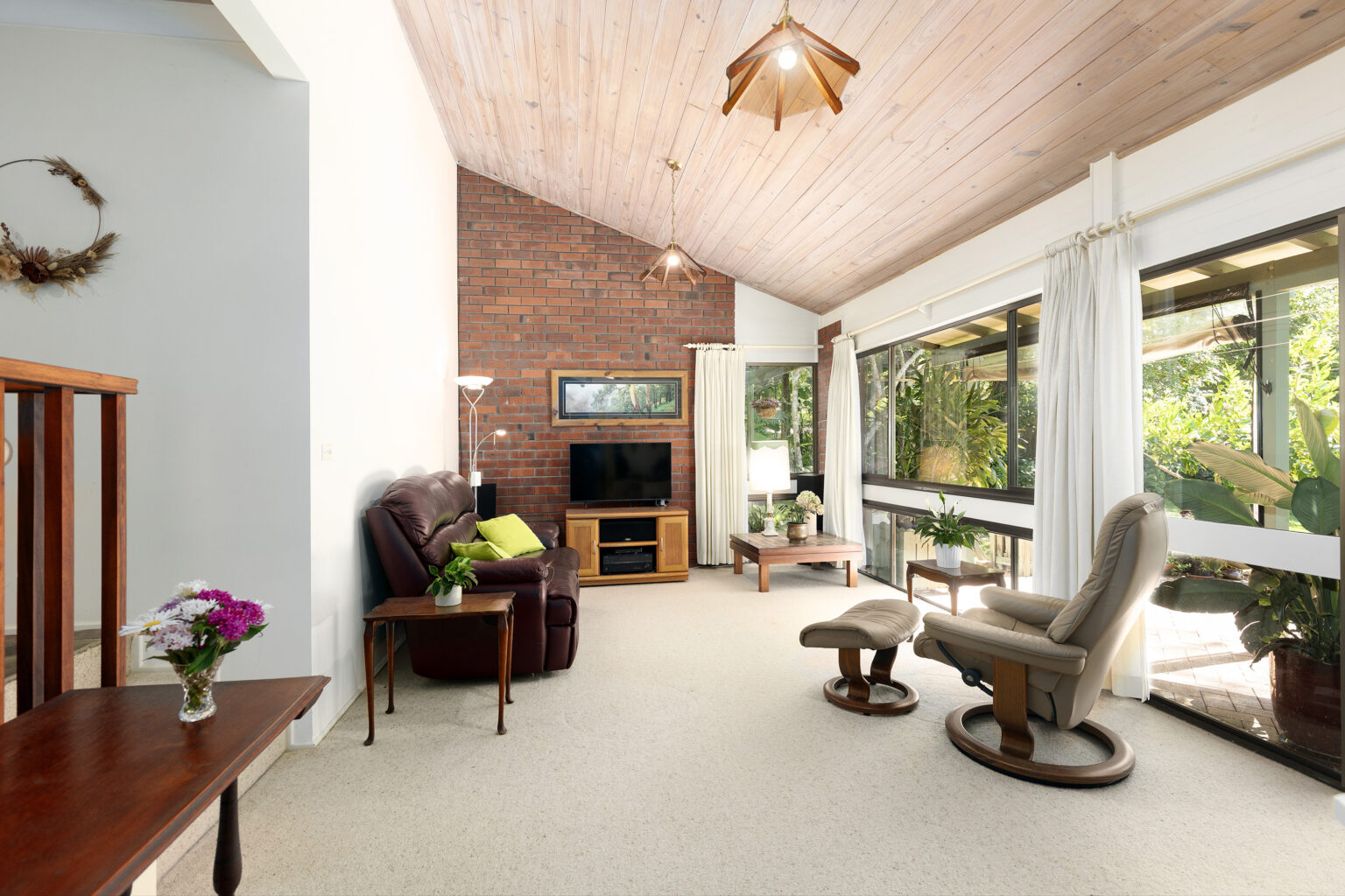 • Separate dining room and spacious lounge with garden views, timber ceilings, and feature brick wall.