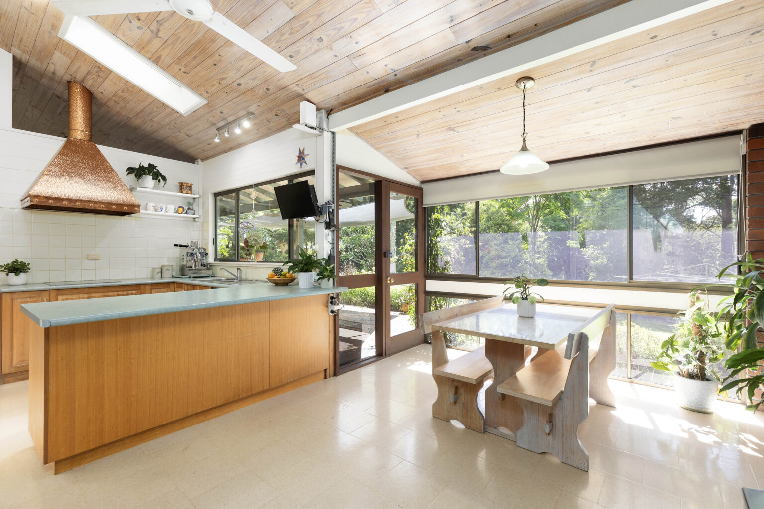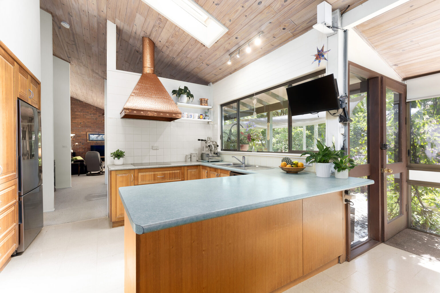 • Tasmanian Oak kitchen with Miele appliances, cooktop, wall oven, dishwasher, pantry, skylight, and stunning copper range hood.