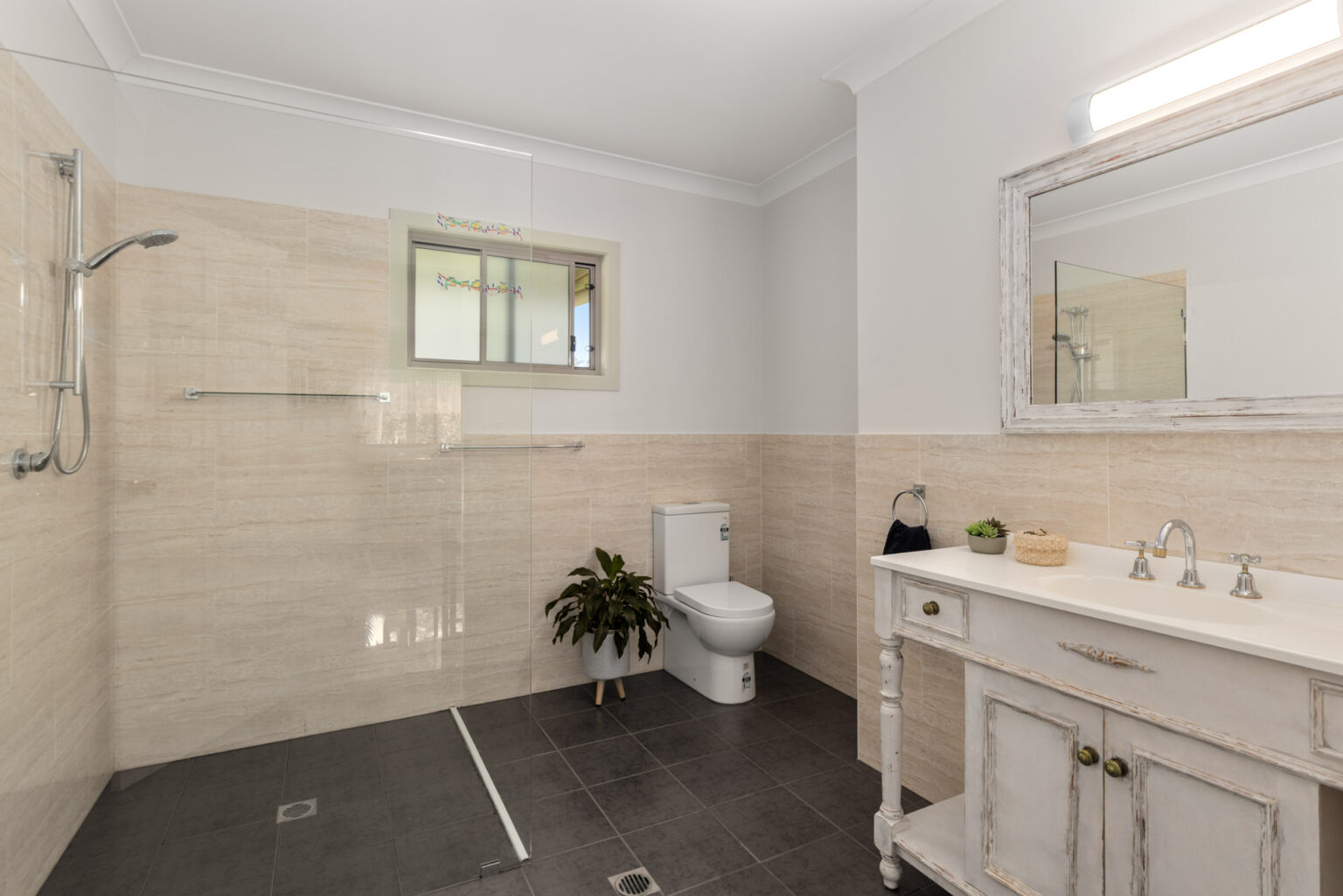 • Spacious bathroom with shower, toilet, vanity and dual entrances