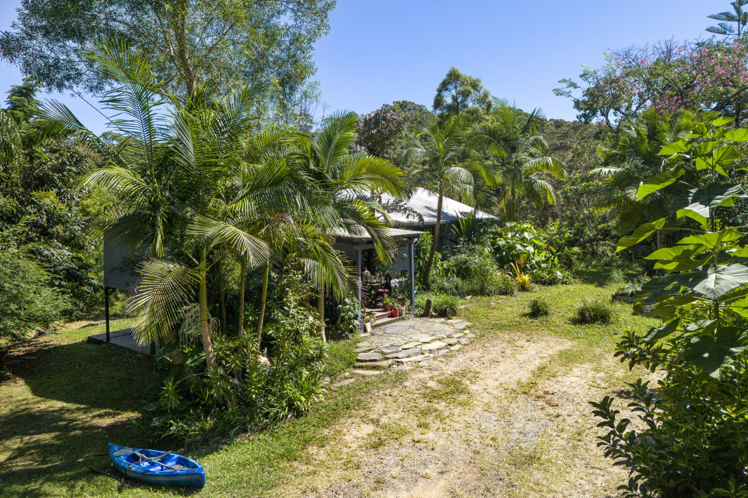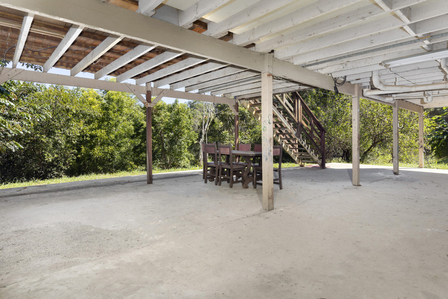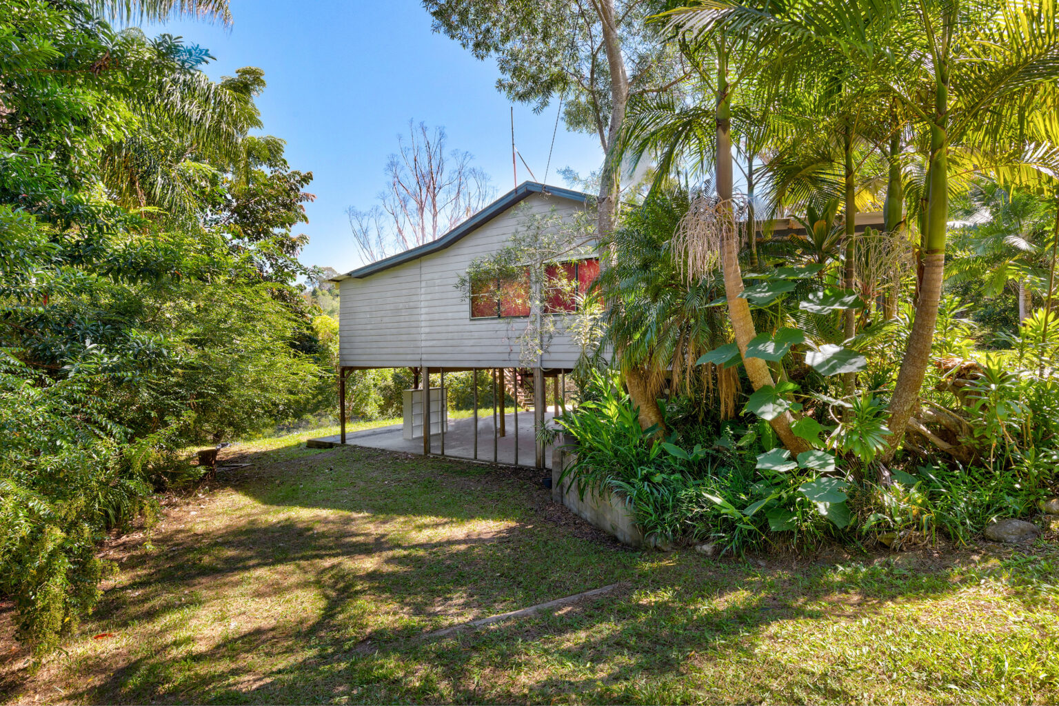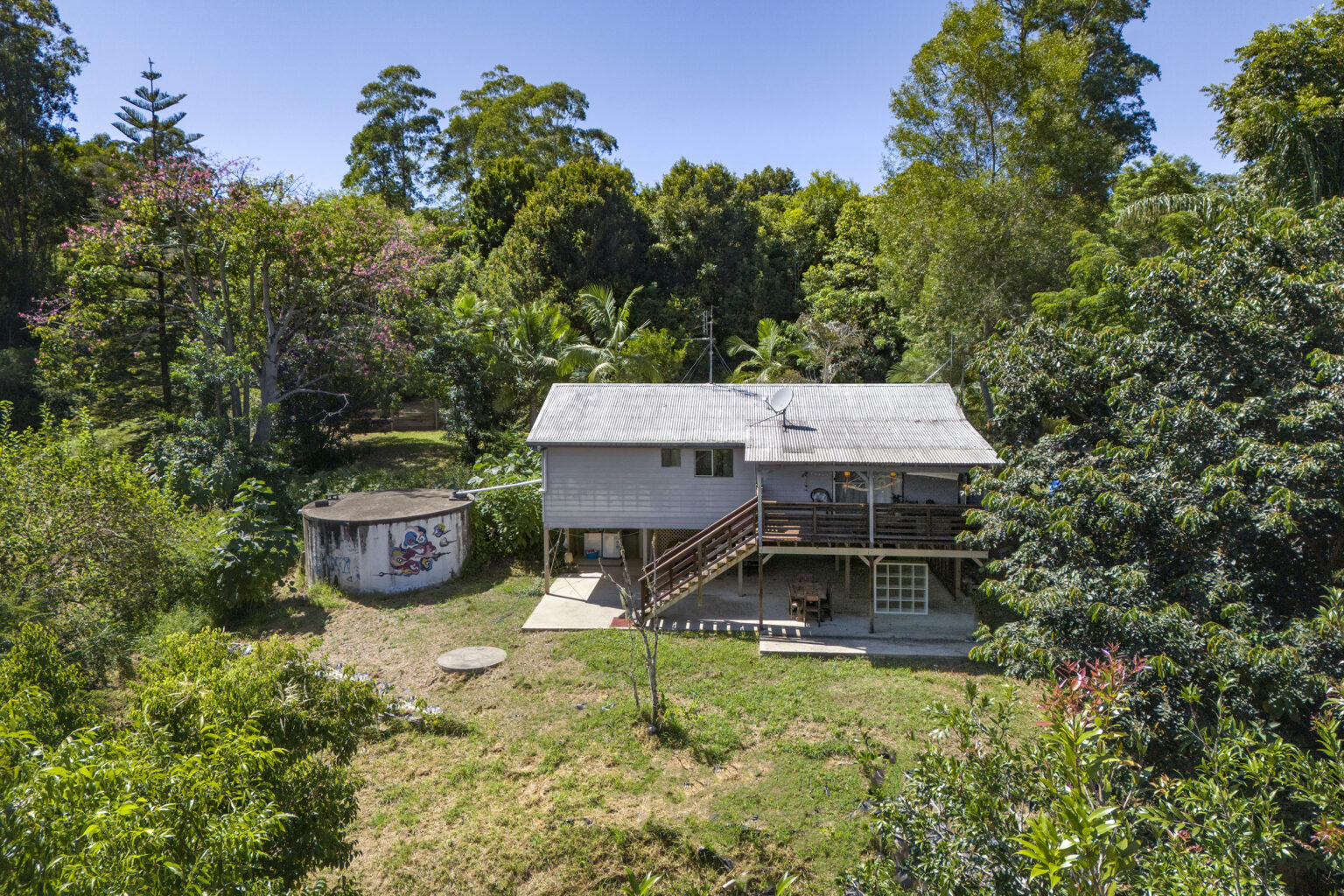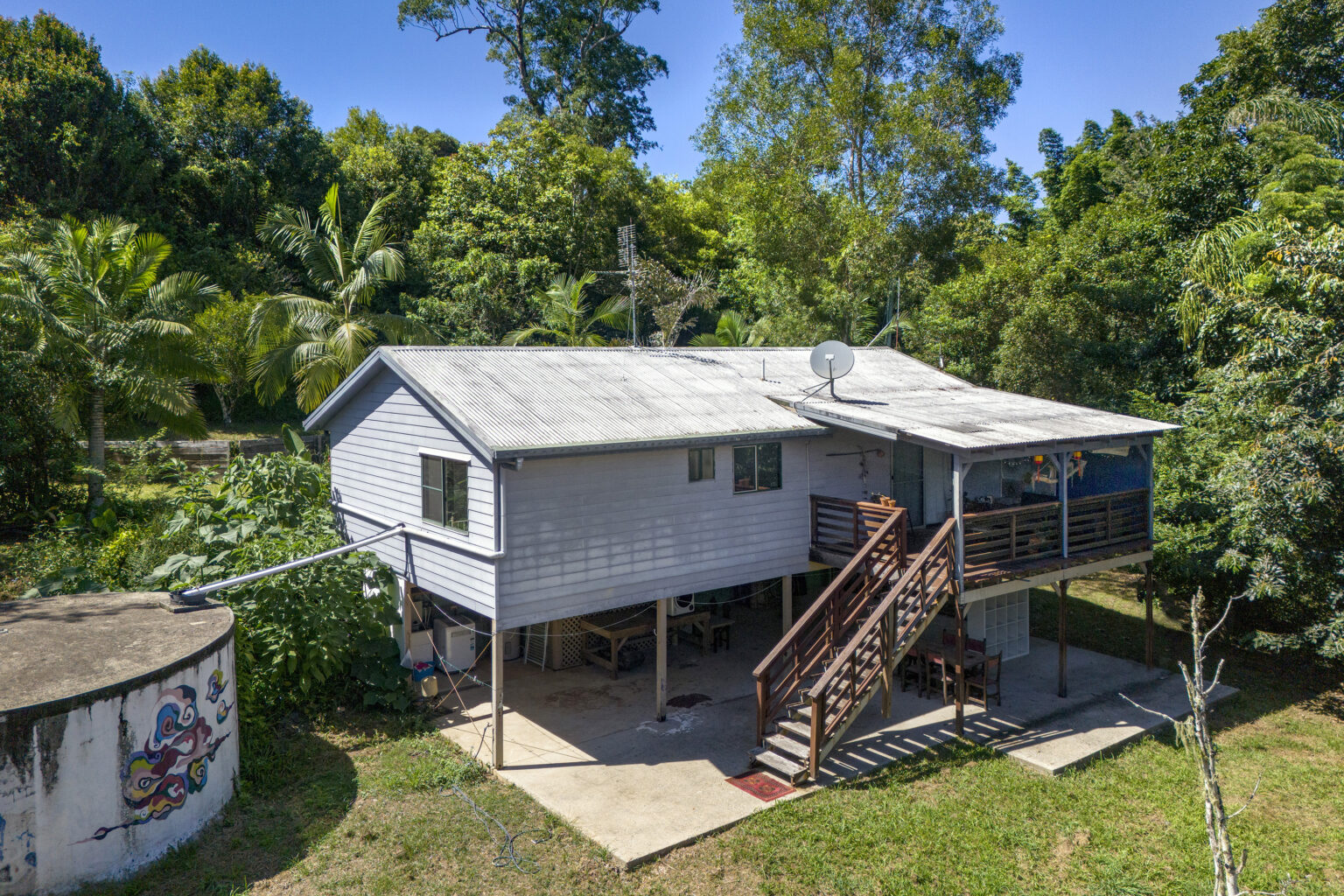Underneath the home, a vast open area awaits, perfect for al fresco gatherings or additional parking and storage. A 10,000-gallon concrete tank, coupled with a bore, water pump with a fresh spring water supply, ensures self-sufficiency, while the new electric hot water system and 8kw reverse cycle air conditioner add modern comforts.