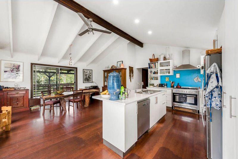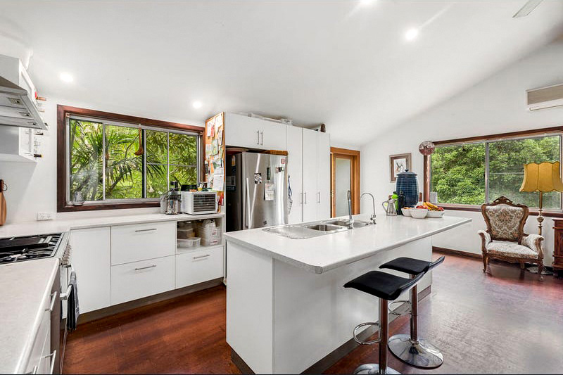 The residence boasts an open-plan layout with soaring high ceilings, creating an airy, light-filled ambience. The kitchen, equipped with a new Euromaid gas cooktop and electric oven, overlooks the dining and living areas, flowing seamlessly onto the entertainment deck, where one can soak in the serenity of the surrounding nature.