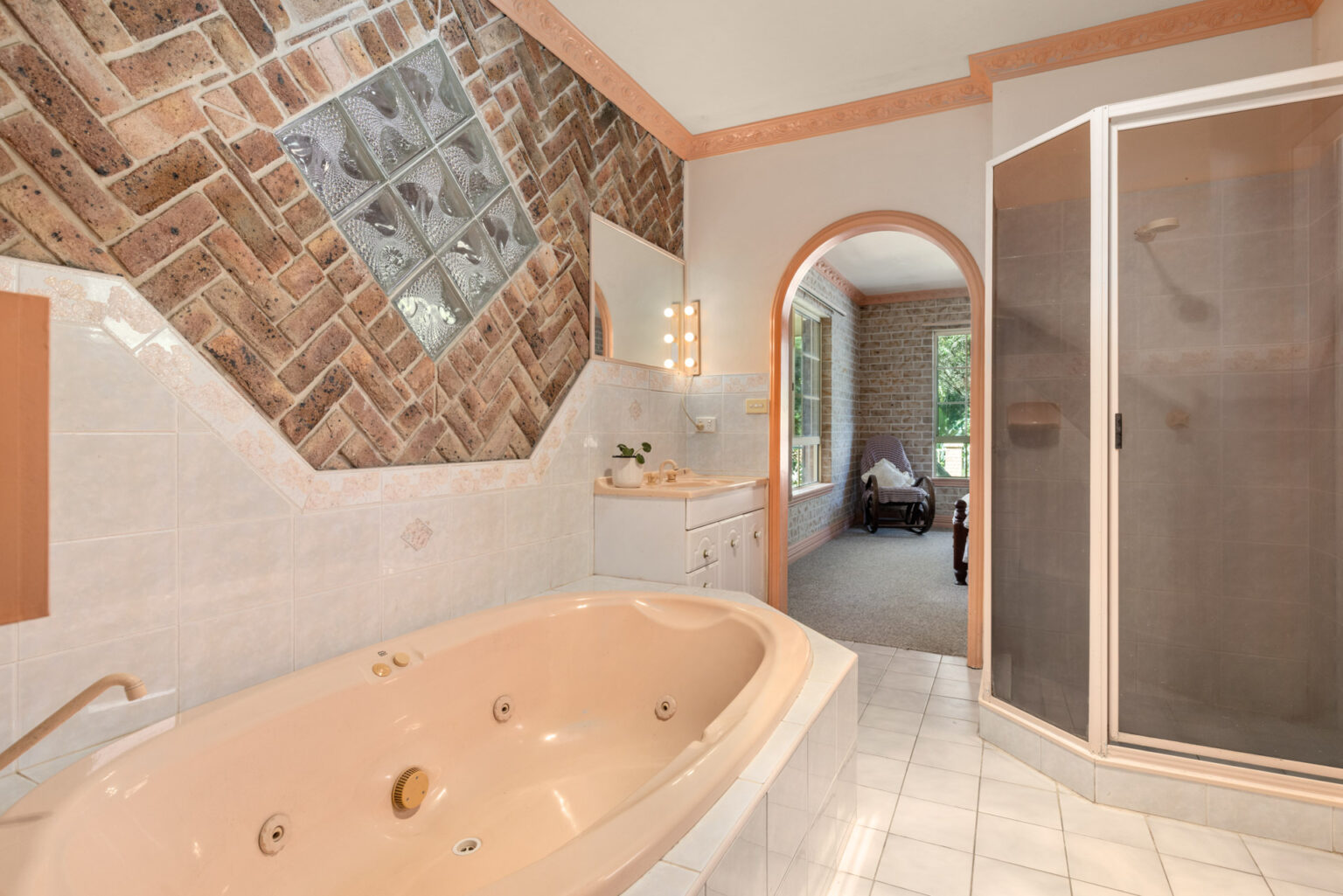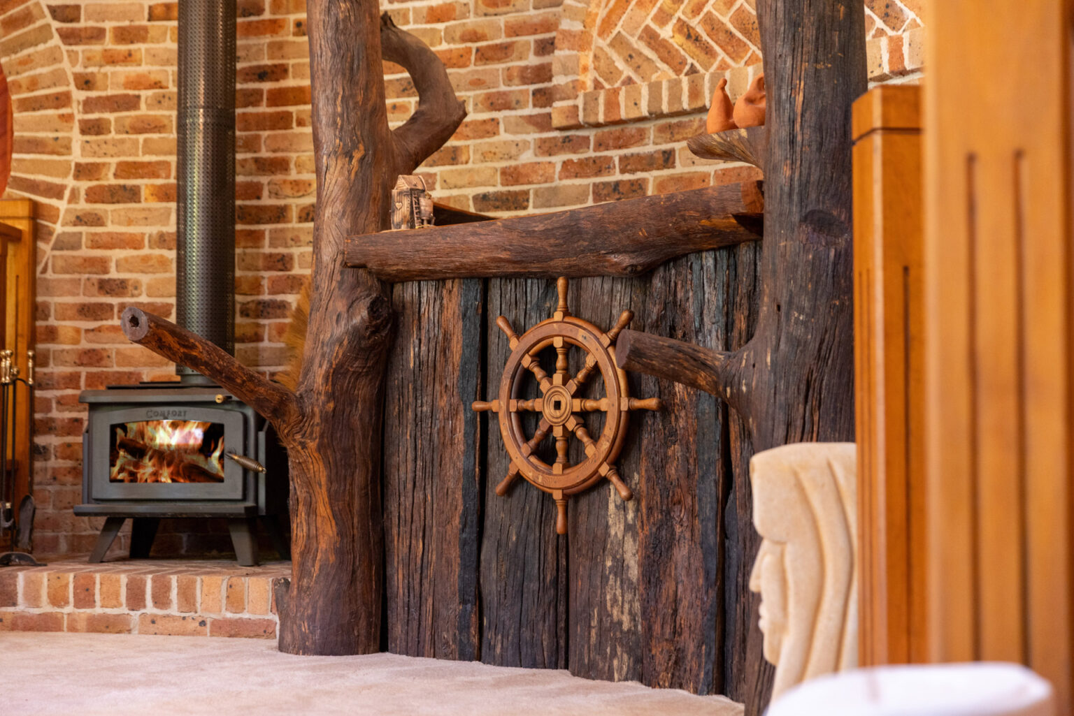 Luxury meets comfort in the sunken circular lounge room, complete with a unique bar, exquisite timber and brick accents, and a cosy wood heater. It’s an ideal space for relaxation and social gatherings, illuminated by a stunning wagon wheel light feature.