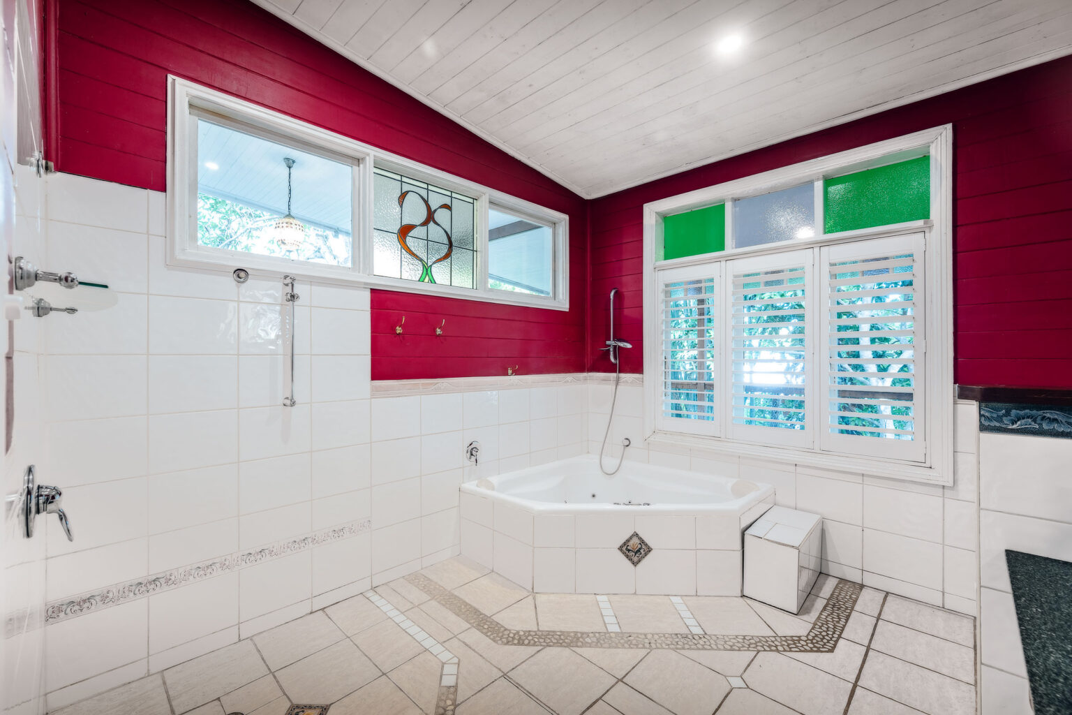 – Classic bathroom with beautiful lead light windows and spa bath